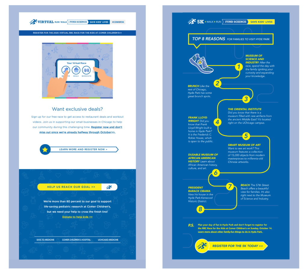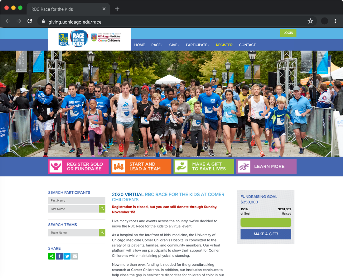 The RBC Race for the Kids at UChicago Medicine Comer Children’s Hospital helps fund the prevention, treatment, and cure of diseases and conditions affecting children’s health in Chicago and across the world. Families and friends of all ages participate in a 5K Run/Walk, Kids’ Dash, and Kids’ Mile.